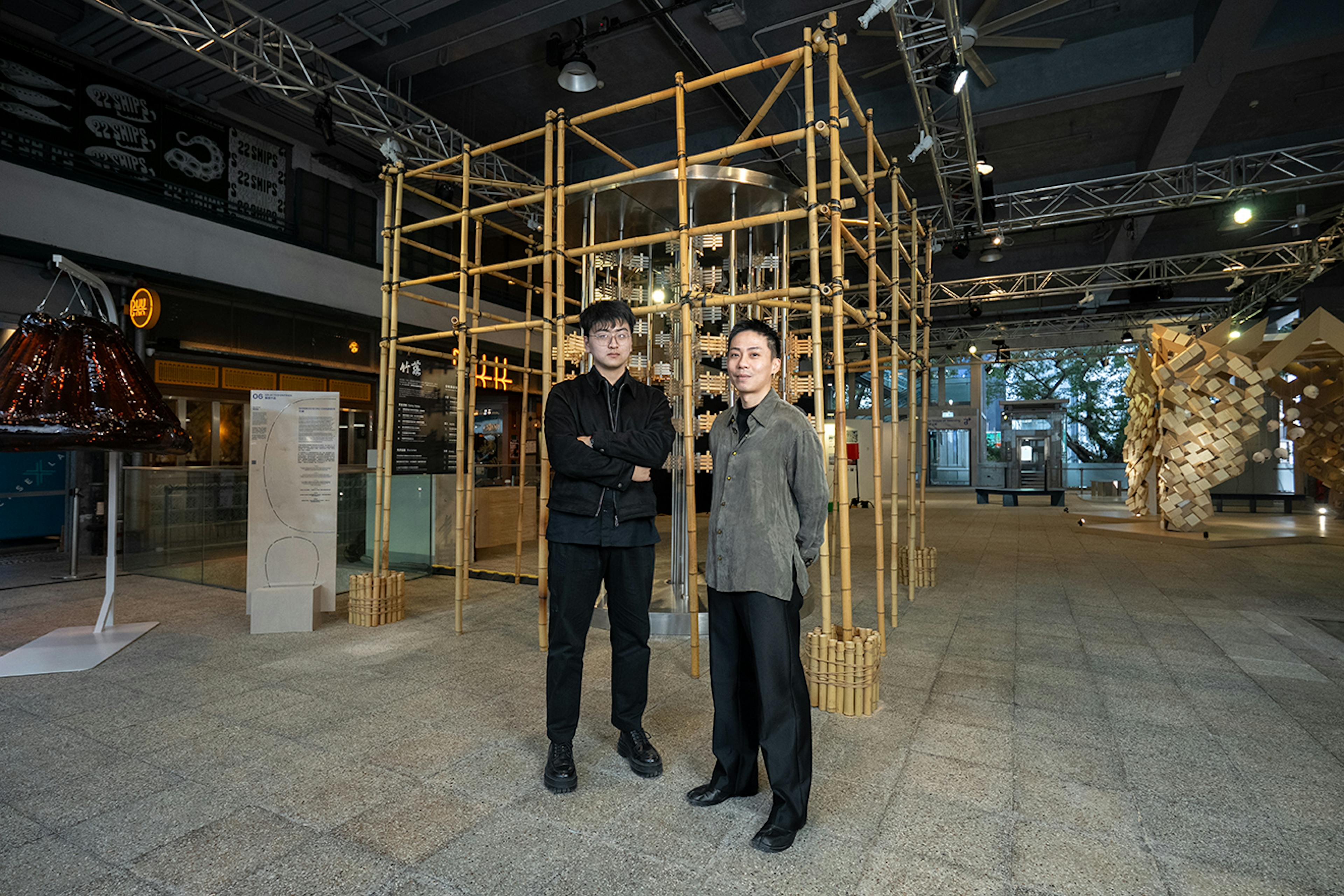 「方」象徵地理人文,外露的機械軸承嵌入文獻,形成一種可觸摸的「地方誌」,基於此,竹子在此作品中作為土地記憶的載體,承載著建築、器具和符號的多重身份。「圓」喻意天道運行,中央的圓形空間透過數控水霧裝置製造流動的雲靄,如同「海市蜃樓」,象徵香港城市形態的探索。而人力貫通天地,觀眾轉動竹軸啟動水霧裝置,溫感變色的0101編碼從透明變為黑色,同時出現二維碼供掃描觀看。歷史與未來在此交融,呼應《易經》的智慧——「觀乎天文以察時變,觀乎人文以化成天下。」