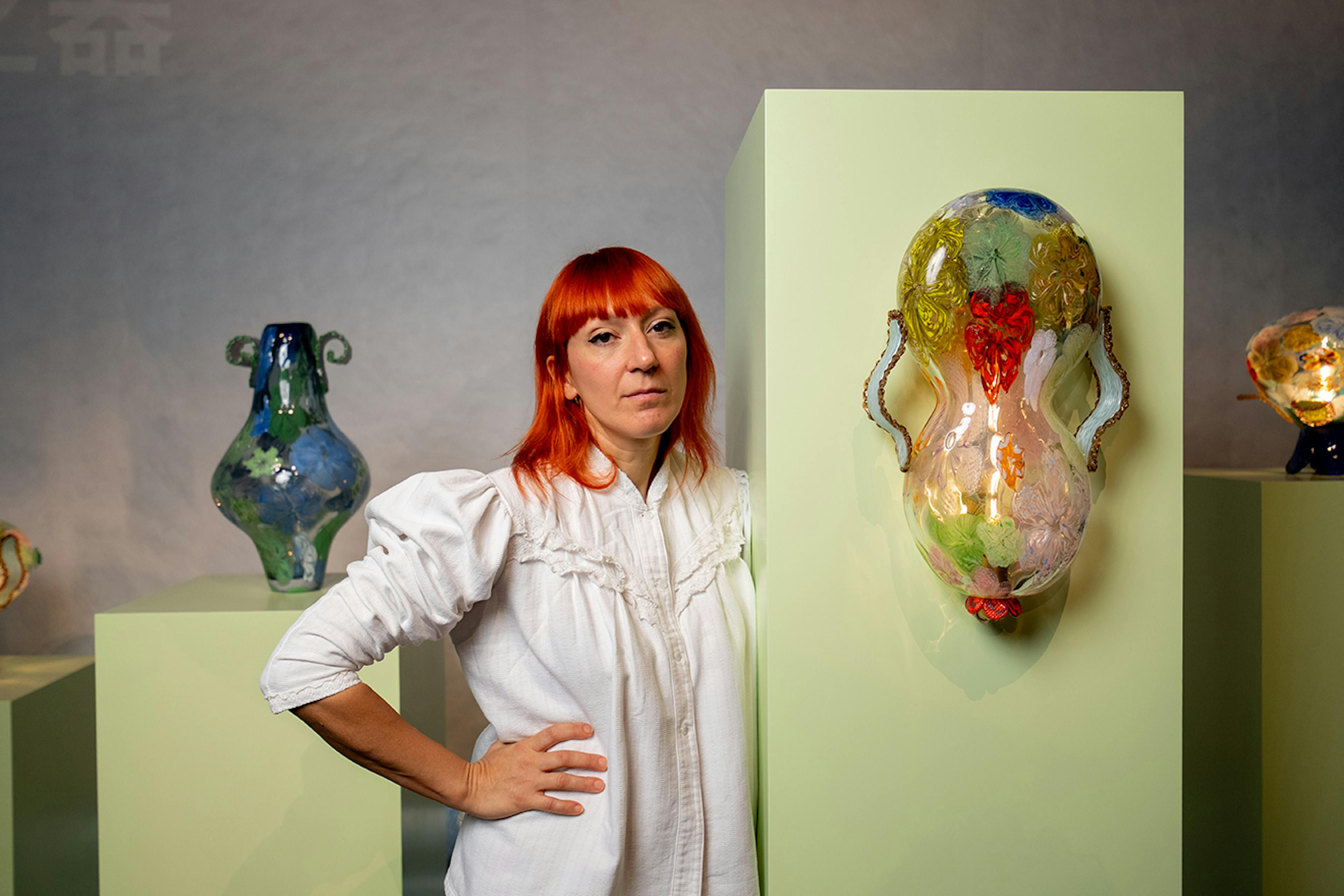 設計師採用威尼斯十九世紀興起的玻璃製作工藝,將玻璃花、漩渦紋與玫瑰花結在熔融玻璃中匯合交織,形成特別的圖案,同時注入大膽鮮明的新色調,在傳承歷史工藝與創新設計之間取得巧妙平衡。
